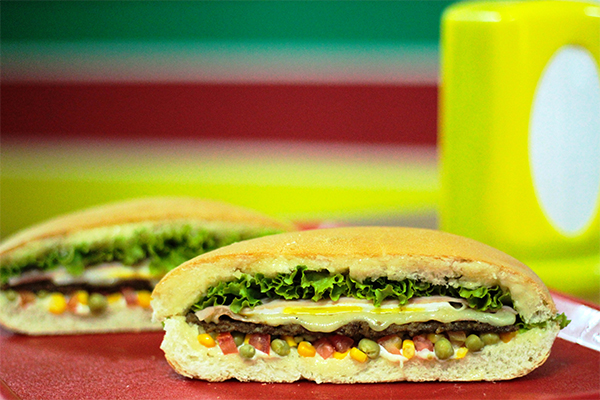 Ingredientes: Pão, maionese, especial, filé mignon, presunto, queijo, ovo, alface,tomate, milho e ervilha.